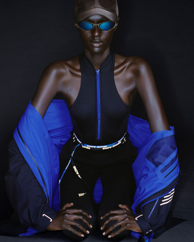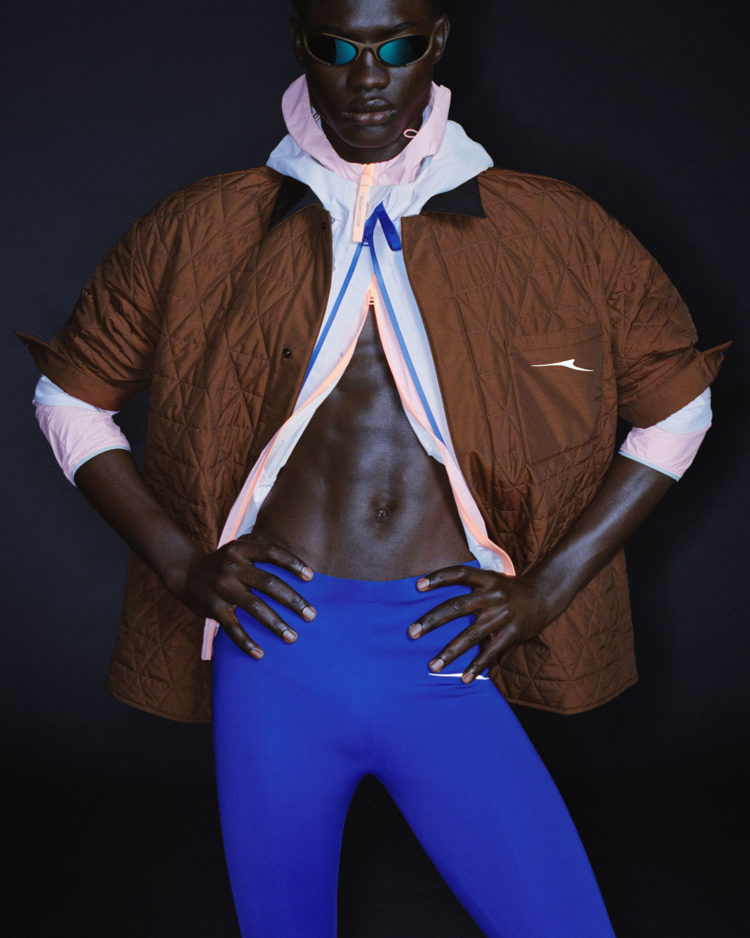 衣服が光やポージング、その瞬間の佇まいにどう共鳴するかを鮮やかに捉えたのは、写真家のティム・エルカイム。体を覆い隠すのではなく、その美しさを引き立たせるウェアは、まるで“第二の肌”のように、纏う人のアクティブなエネルギーを増幅させる。コレクション全体を通して、軽量なカラーブロックのウィンドブレーカーやリフレクター仕様のキルティングジャケット、タイトなジャージー素材などのプロダクトが、パフォーマンスの向上に留まらず、シルエットとリズムを鮮やかに形作っている。
