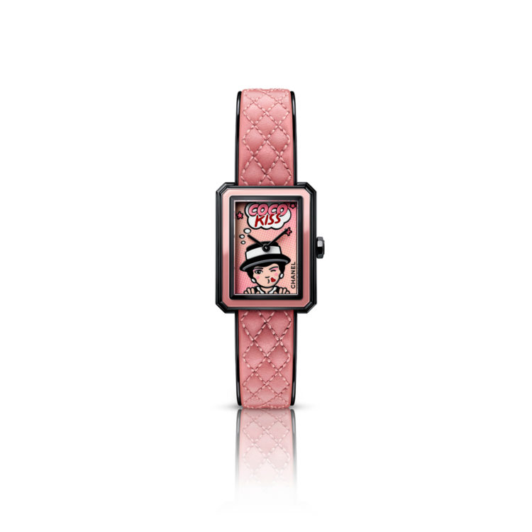 本コレクションを手掛けたのは、「シャネル ウォッメイキング クリエイション スタジオ」のディレクター、アルノー・シャスタン。「シャネルのビューティー アイテムのヴィジュアル的なアプローチは非常に魅惑的で、そのグラフィカルな美しさはインスピレーションを誘います。洗練された構造と考え抜かれたデザイン。私が惹かれたのは、シャネルのビューティー アイテムに宿る、有無を言わせぬエレガンスです。濃厚なレッドの色合いや、柔和なパウダーピンクを際立たせるブラックラッカー ケースの深みは、シャネルのクリエイションに共通する美学を感じさせます。シャネルのメークアップのパレット、ペンシル、ブラシ、パウダーやそれらのテクスチャーは、オート オルロジュリーの世界とも共通する理念があります。私はそこから、ドリッピング アートやポップ アートといった芸術ムーブメントとのつながりを構築するインスピレーションを汲みました。より美しくなりたいのなら、メークアップは有効な手段です。この美のビジョンこそが、コレクション全体を鼓動させることとなったのです」。そう語る彼が描いたのは、鮮やかなピンクや深いレッドの色彩が、ブラックの中で躍動する、まるでメークアップそのもの。
