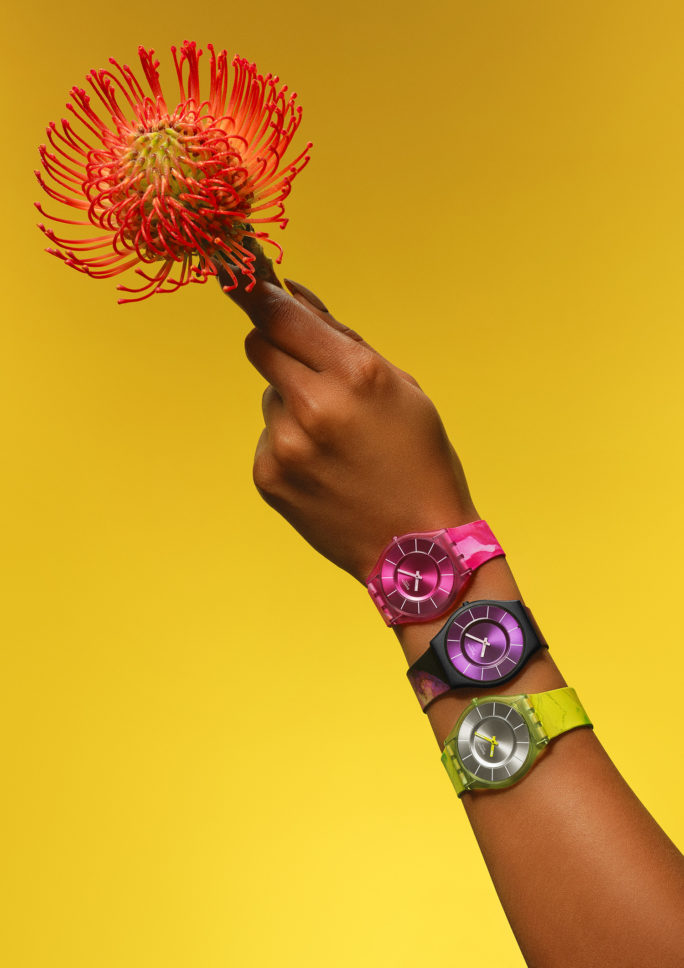印象的なカラーコンビネーションを纏った“PAINTED PARADISE”コレクションが体現するのは、1997年に誕生した「スウォッチ」の印象的な“SKIN”ラインの純粋なミニマリズム。「Less is More」という思想のもとにデザインされた比類なき薄型シルエットにして軽量フォルム、そして洗練されたコンテンポラリーなデザインは、忙しい日常の中で自由と軽やかさを感じさせるトロピカルなオアシスのような存在ともいえる。